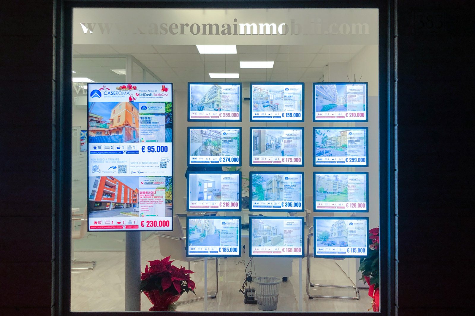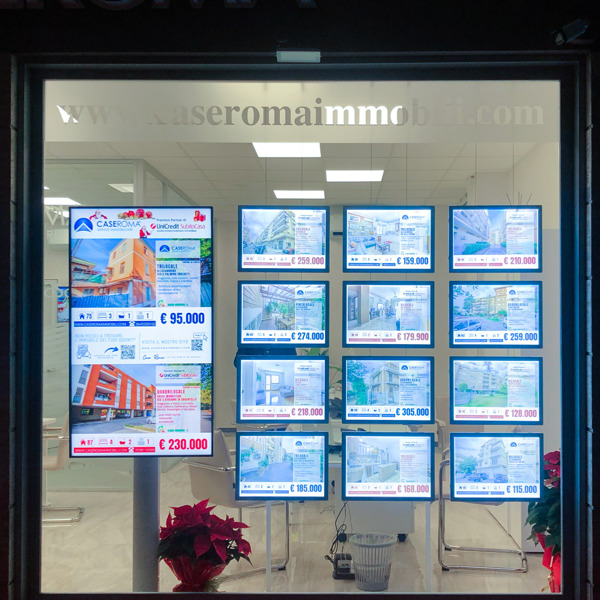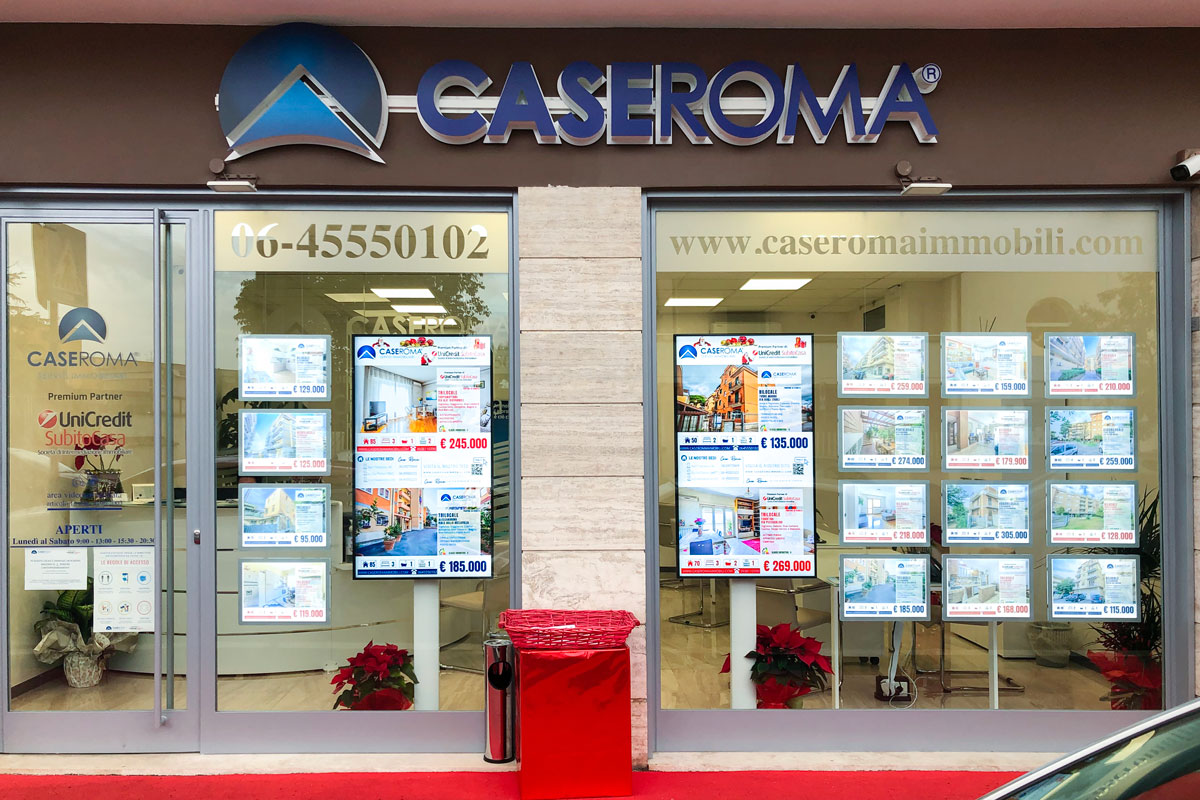 Il progetto ha previsto l’inserimento di soluzioni di digital signage in diversi spazi strategici. In vetrina sono stati installati due display professionali Samsung da 55’’, capaci di trasformare l’affaccio su strada in una vetrina digitale di grande impatto visivo. Grazie a immagini in 4K, colori brillanti e pannelli anti-riflesso, gli schermi permettono di mostrare in tempo reale il portfolio immobiliare e le promozioni.
