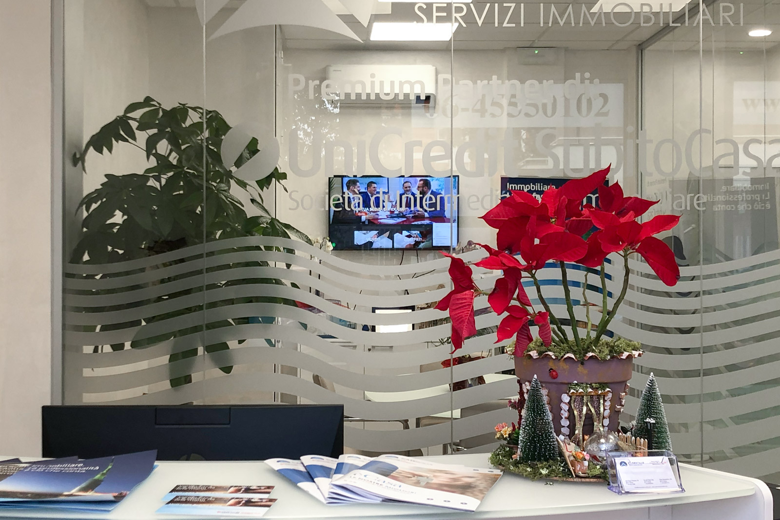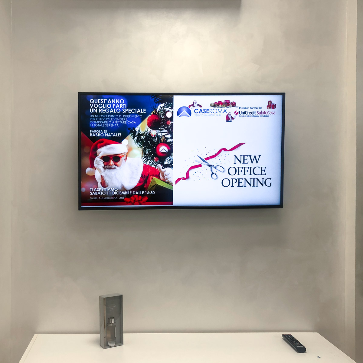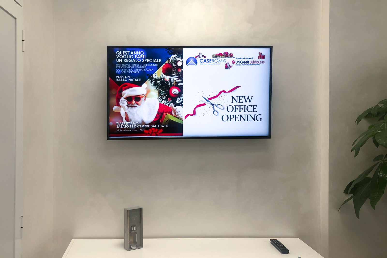 Il progetto ha previsto l’inserimento di soluzioni di digital signage in diversi spazi strategici. In vetrina sono stati installati due display professionali Samsung da 55’’, capaci di trasformare l’affaccio su strada in una vetrina digitale di grande impatto visivo. Grazie a immagini in 4K, colori brillanti e pannelli anti-riflesso, gli schermi permettono di mostrare in tempo reale il portfolio immobiliare e le promozioni.