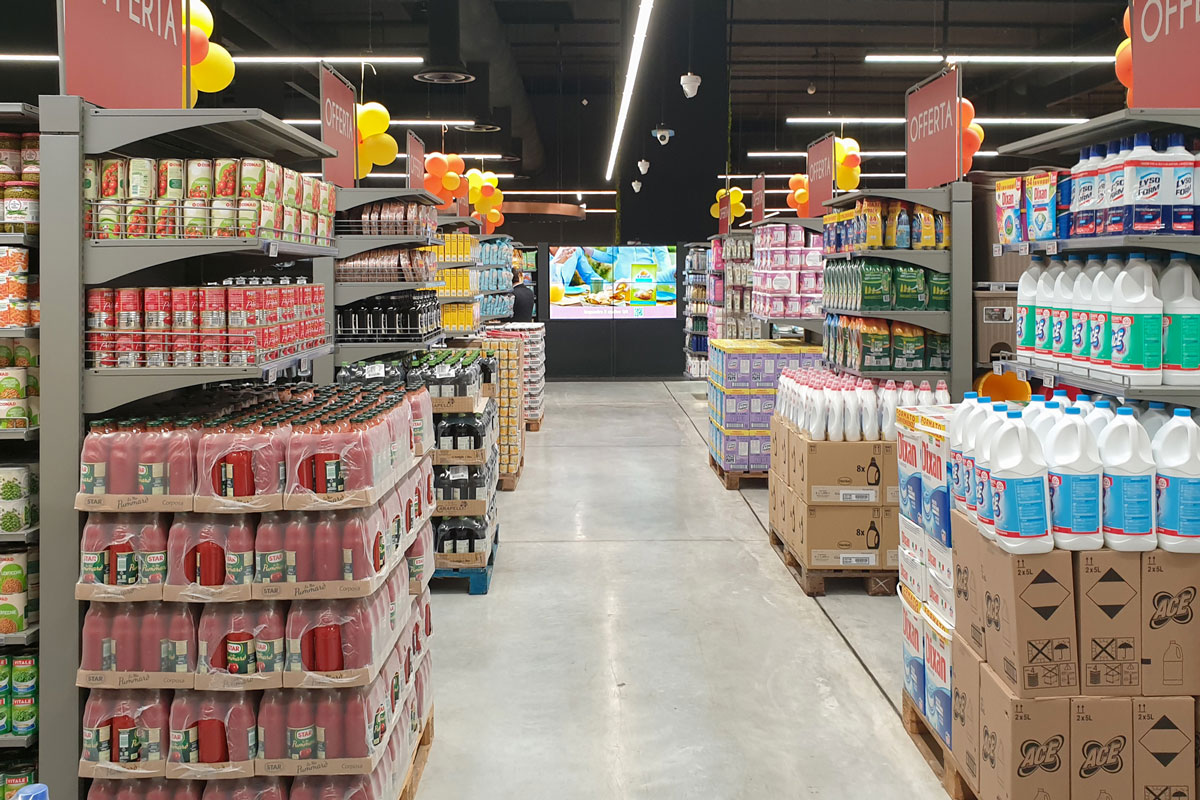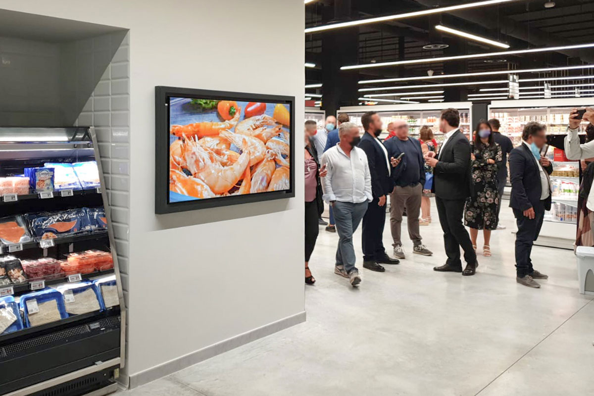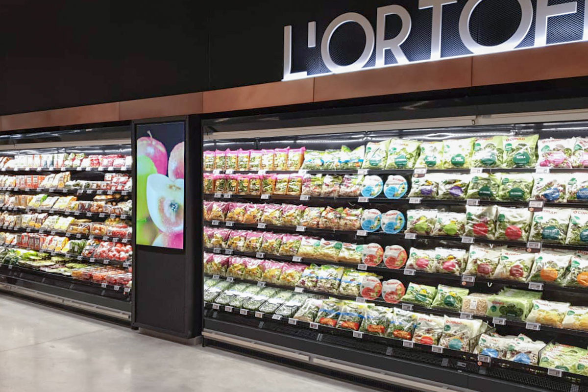 Monitor da 55 e 43 pollici arricchiscono i reparti ortofrutta, pescheria e macelleria, mentre un videowall 2×2 da 92 pollici si distingue nelle corsie dei generi vari.