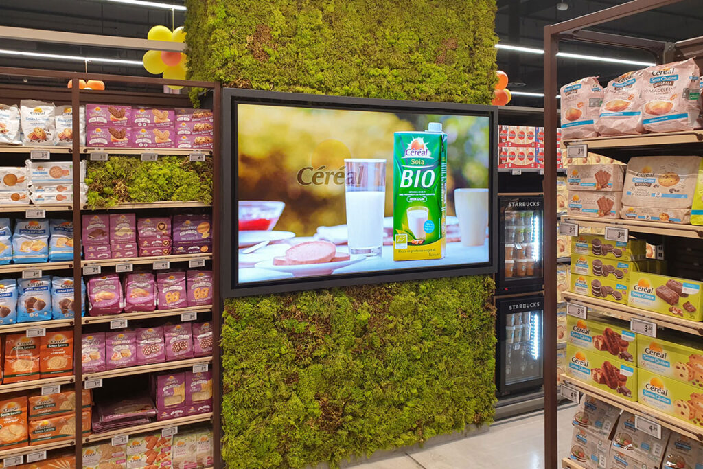 Le nostre soluzioni smart signage sono distribuite in tutto il percorso d’acquisto. Un grande display da 85 pollici accoglie i clienti all’ingresso, mentre uno schermo da 75 pollici mette in evidenza le proposte del biomarket.