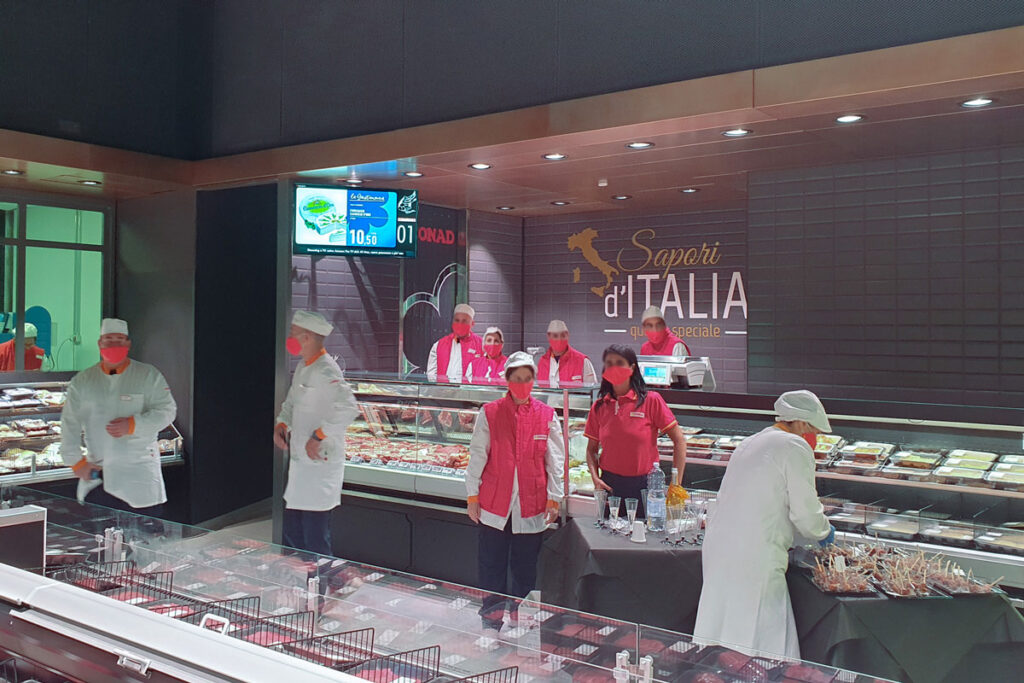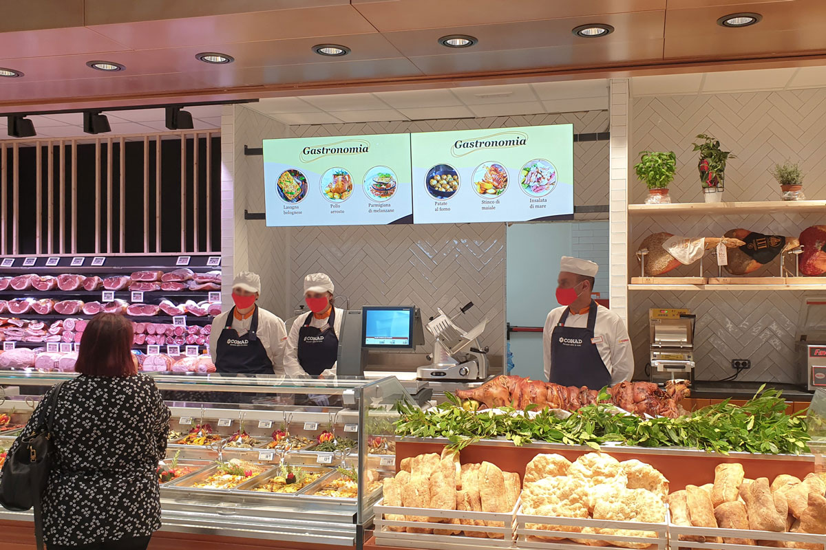 Un menu board 2×1 da 55 pollici presenta le offerte del banco gastronomia e cinque eliminacode da 50 pollici facilitano la gestione delle attese.