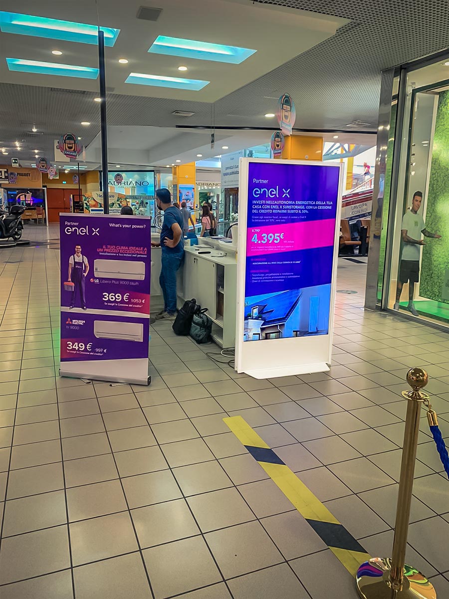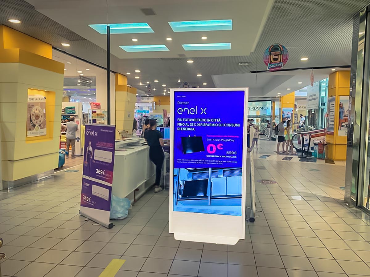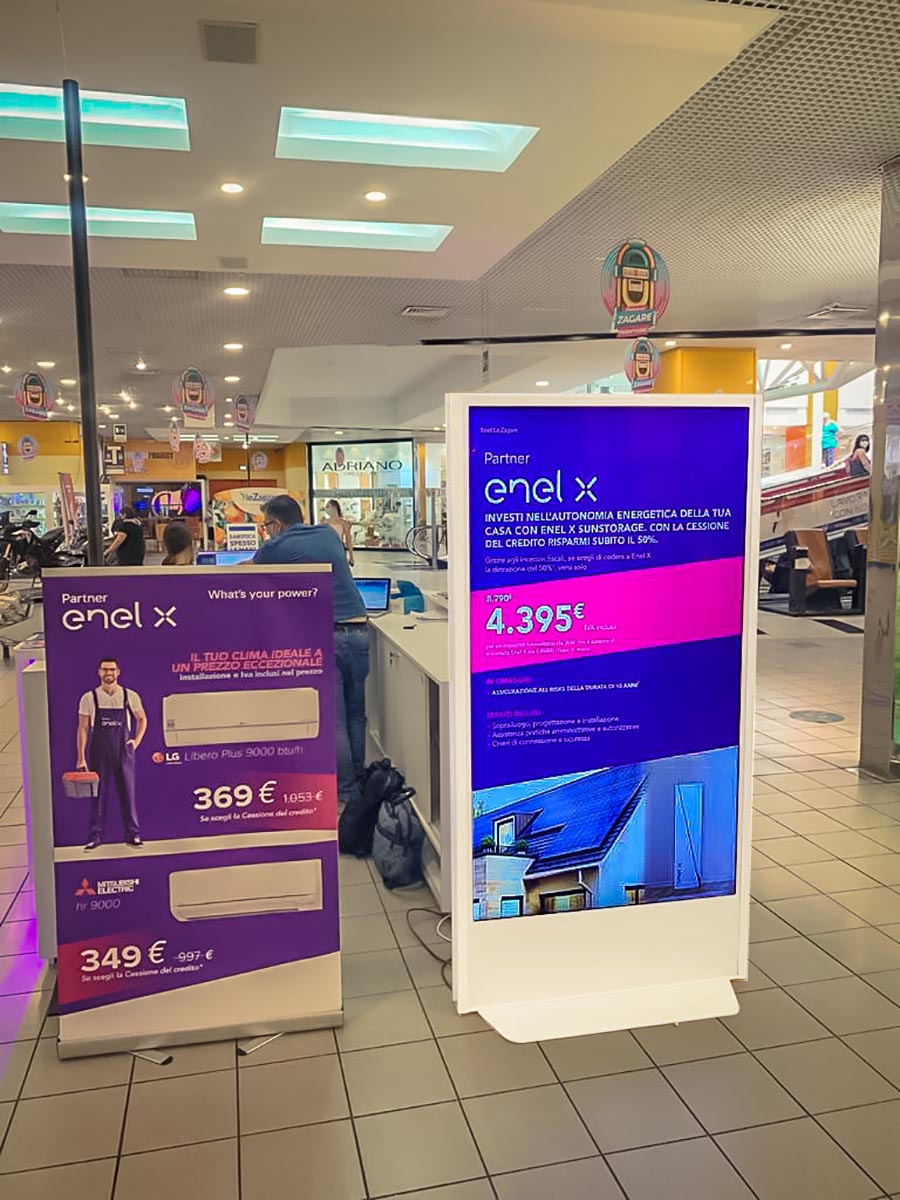Per il corner Enel X allestito all’interno del Centro Commerciale Le Zagare di San Giovanni la Punta (Catania) è stato progettato un totem multimediale autoportante con display professionale da 75 pollici. La struttura, realizzata con intelaiatura in ferro e pannellature in alluminio dibond verniciato, unisce solidità, stabilità e un’estetica essenziale, integrandosi in modo armonioso all’interno dello spazio commerciale.