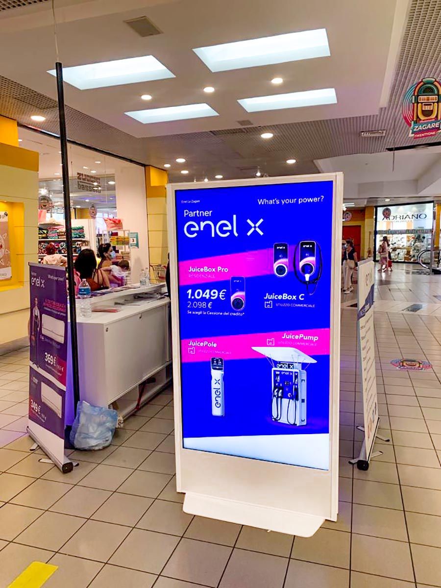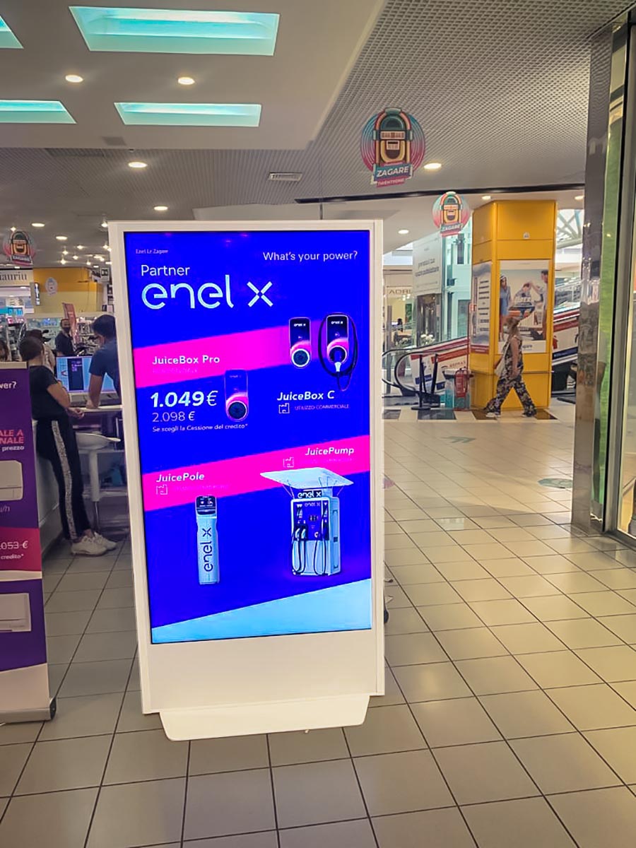 Il design minimale valorizza la qualità visiva e la luminosità del display LCD professionale Samsung, dando vita a una soluzione di comunicazione immediata ed efficace. Il totem funge da vero e proprio info point, facilmente riconoscibile e accessibile, capace di attirare l’attenzione dei visitatori e supportare gli operatori Enel X nella promozione di servizi, attività e iniziative in corso. Una soluzione che migliora la fruibilità delle informazioni e contribuisce al tempo stesso all’estetica della location.
