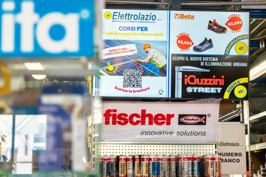 Gli schermi supportano una comunicazione versatile: dalla promozione delle offerte commerciali alla diffusione dei canali social, fino alla condivisione di QR code che permettono ai clienti di accedere rapidamente a informazioni aggiuntive.
