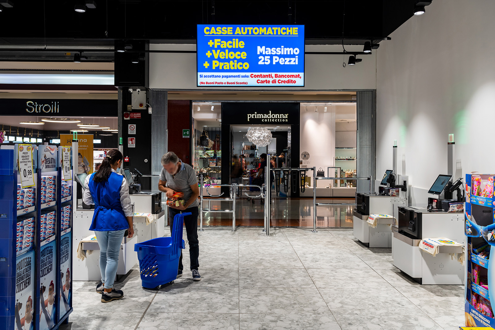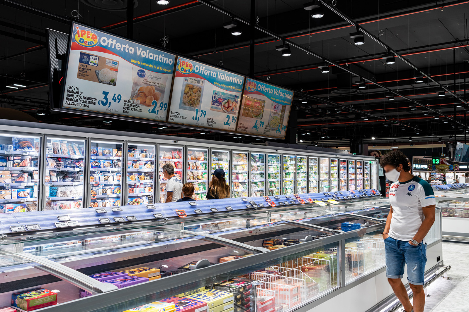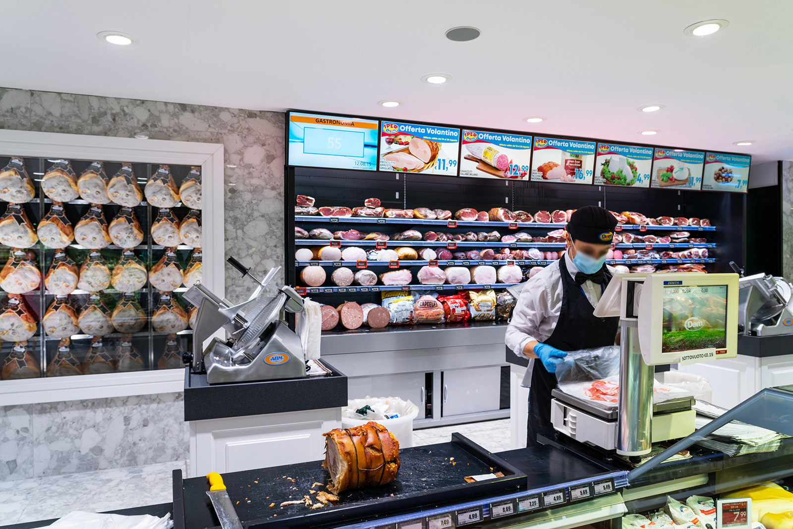 Il banco Gastronomia è valorizzato da 7 display affiancati da 32 pollici, mentre nel reparto Surgelati sono stati installati anche due schermi verticali da 65 pollici. Un ulteriore display da 65 pollici è posizionato in prossimità delle casse automatiche, dove fornisce istruzioni e indicazioni sulle modalità di pagamento.