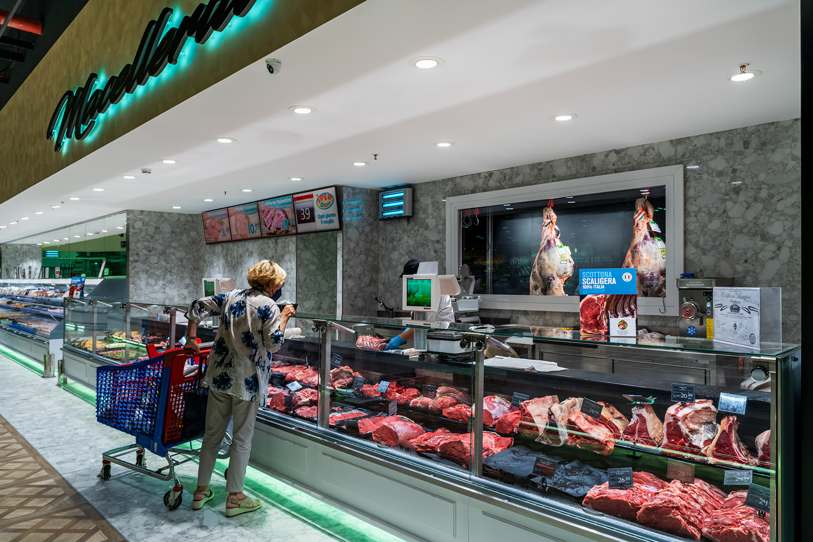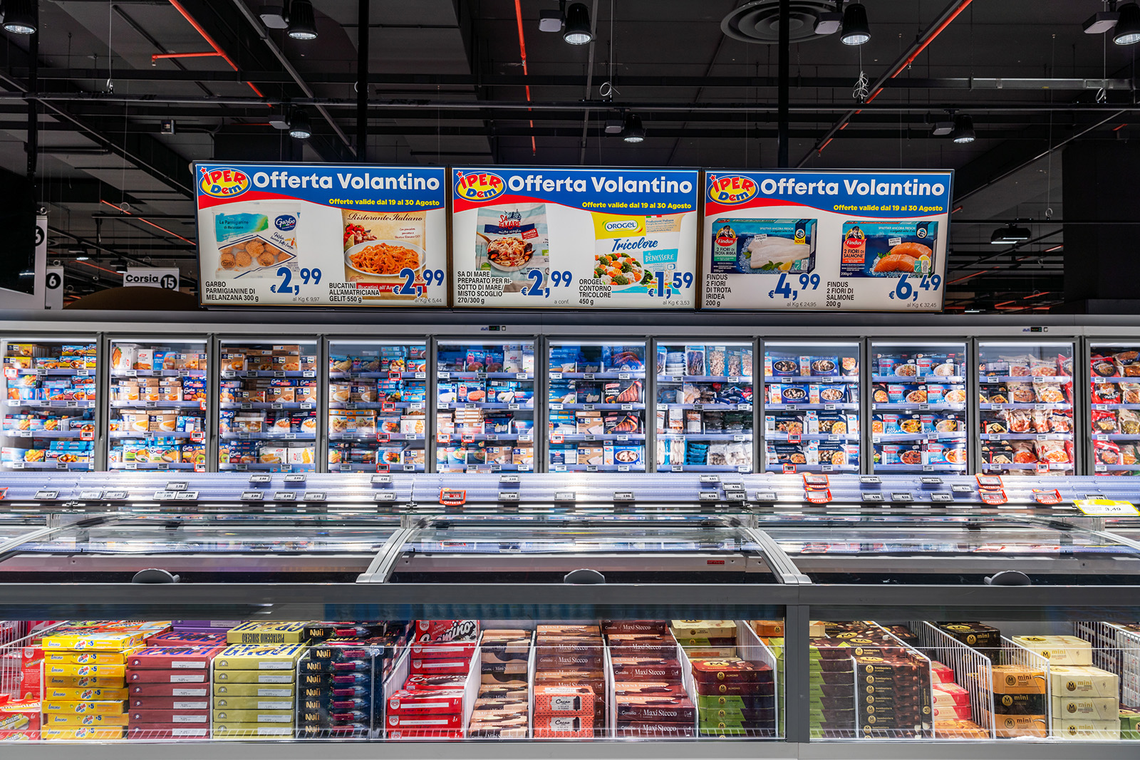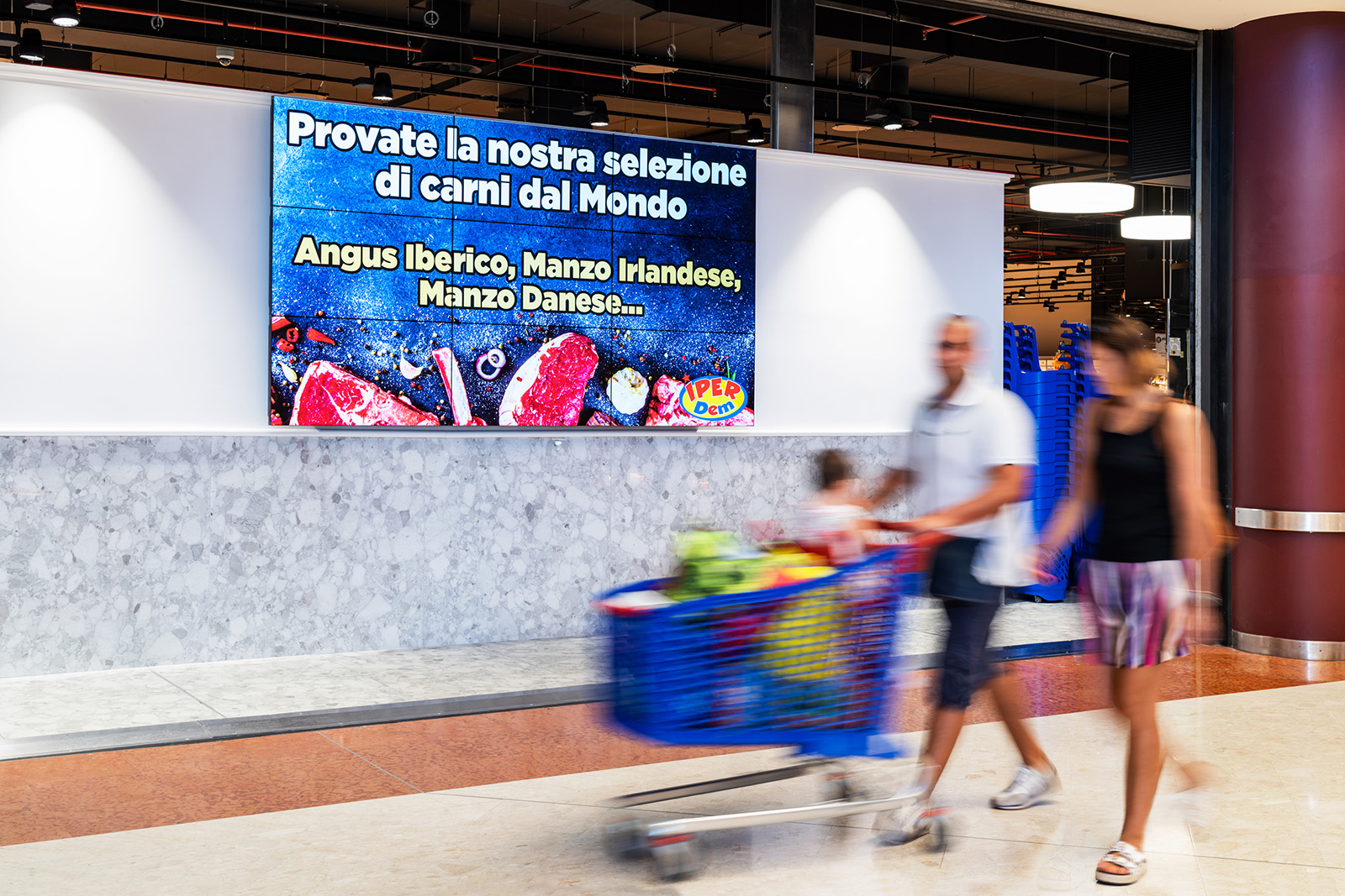Il banco Gastronomia è valorizzato da 7 display affiancati da 32 pollici, mentre nel reparto Surgelati sono stati installati anche due schermi verticali da 65 pollici. Un ulteriore display da 65 pollici è posizionato in prossimità delle casse automatiche, dove fornisce istruzioni e indicazioni sulle modalità di pagamento.