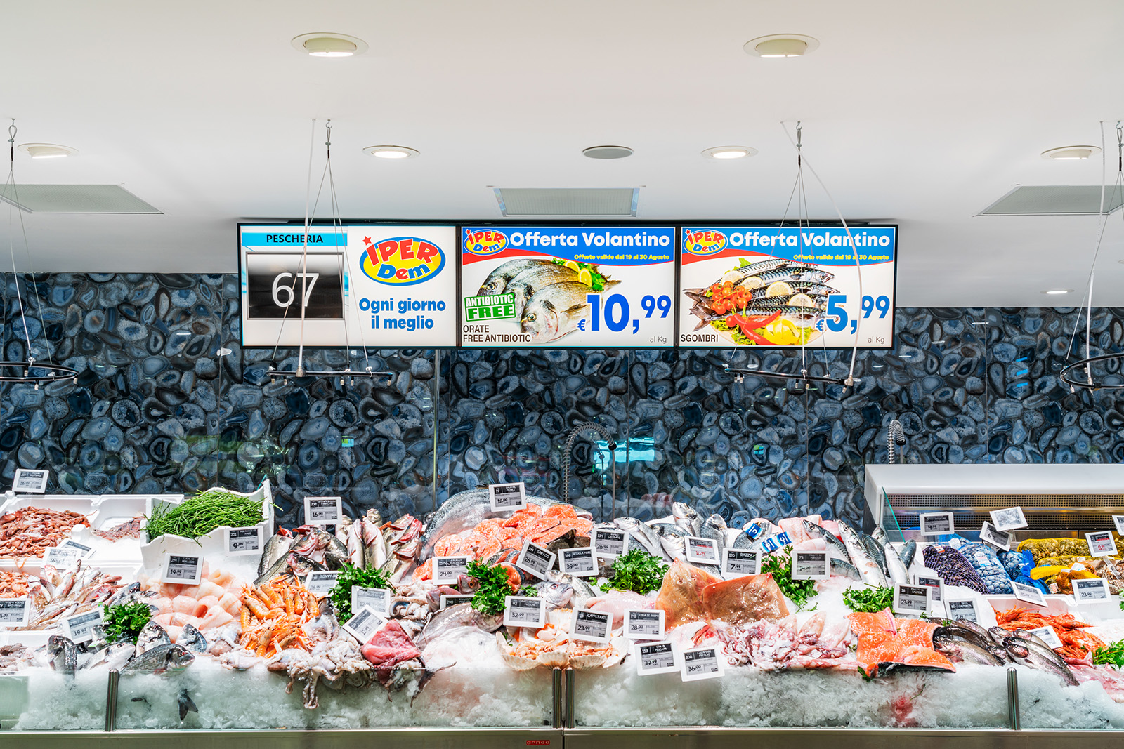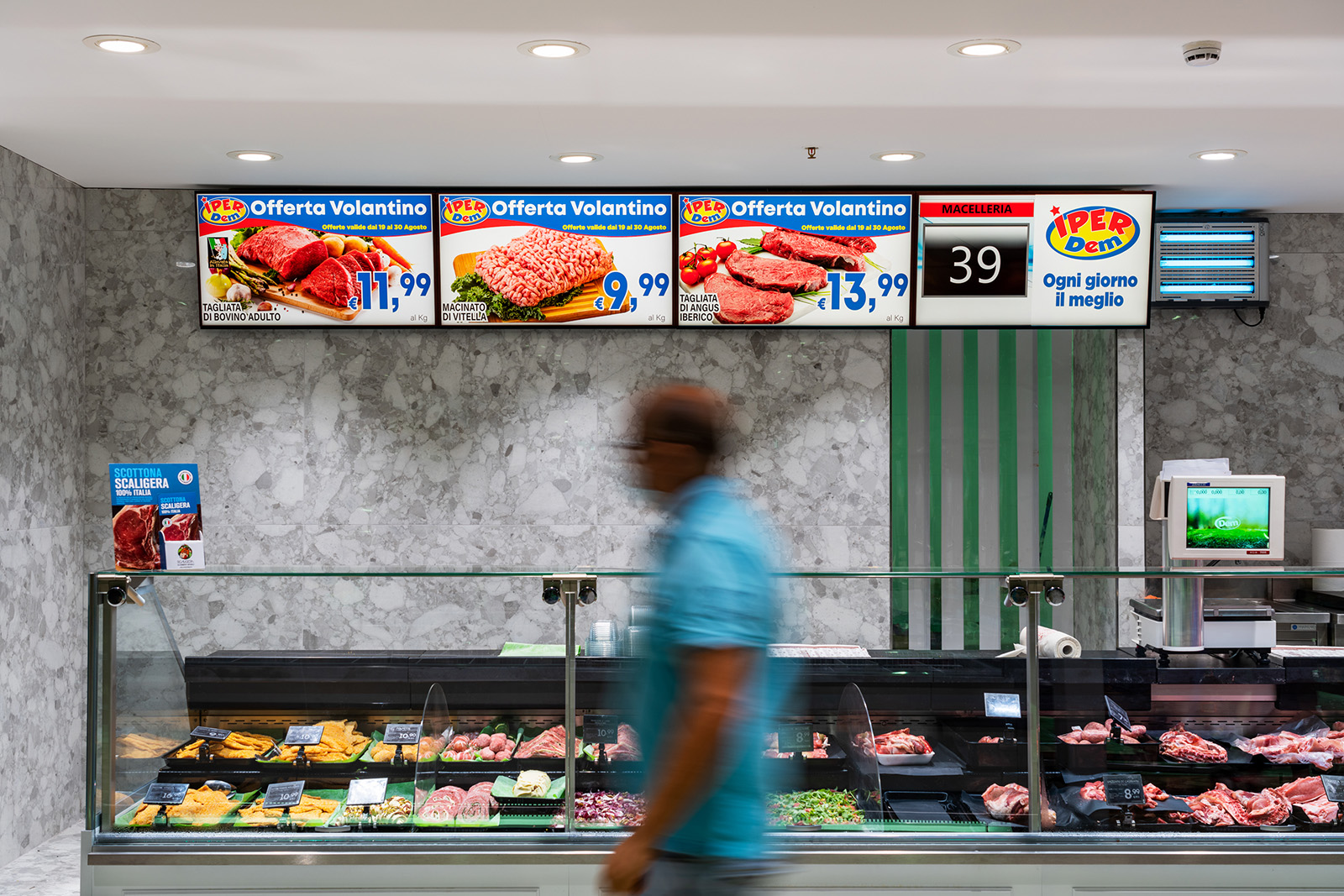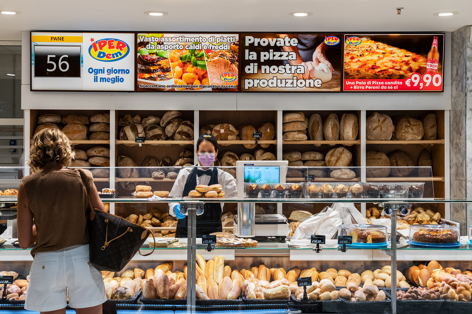 Nei reparti Pane e Pizza, Macelleria, Pescheria e Surgelati sono presenti gruppi di display da 43 pollici, utilizzati per comunicare offerte, suggerire specialità o supportare il sistema eliminacode, mantenendo alta l’attenzione dei clienti in attesa.