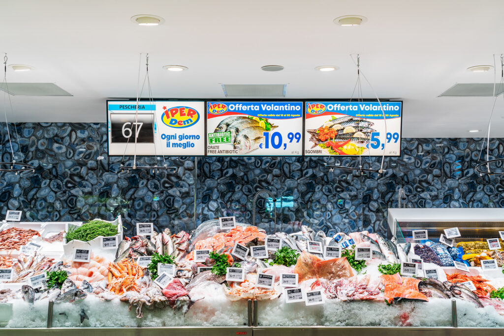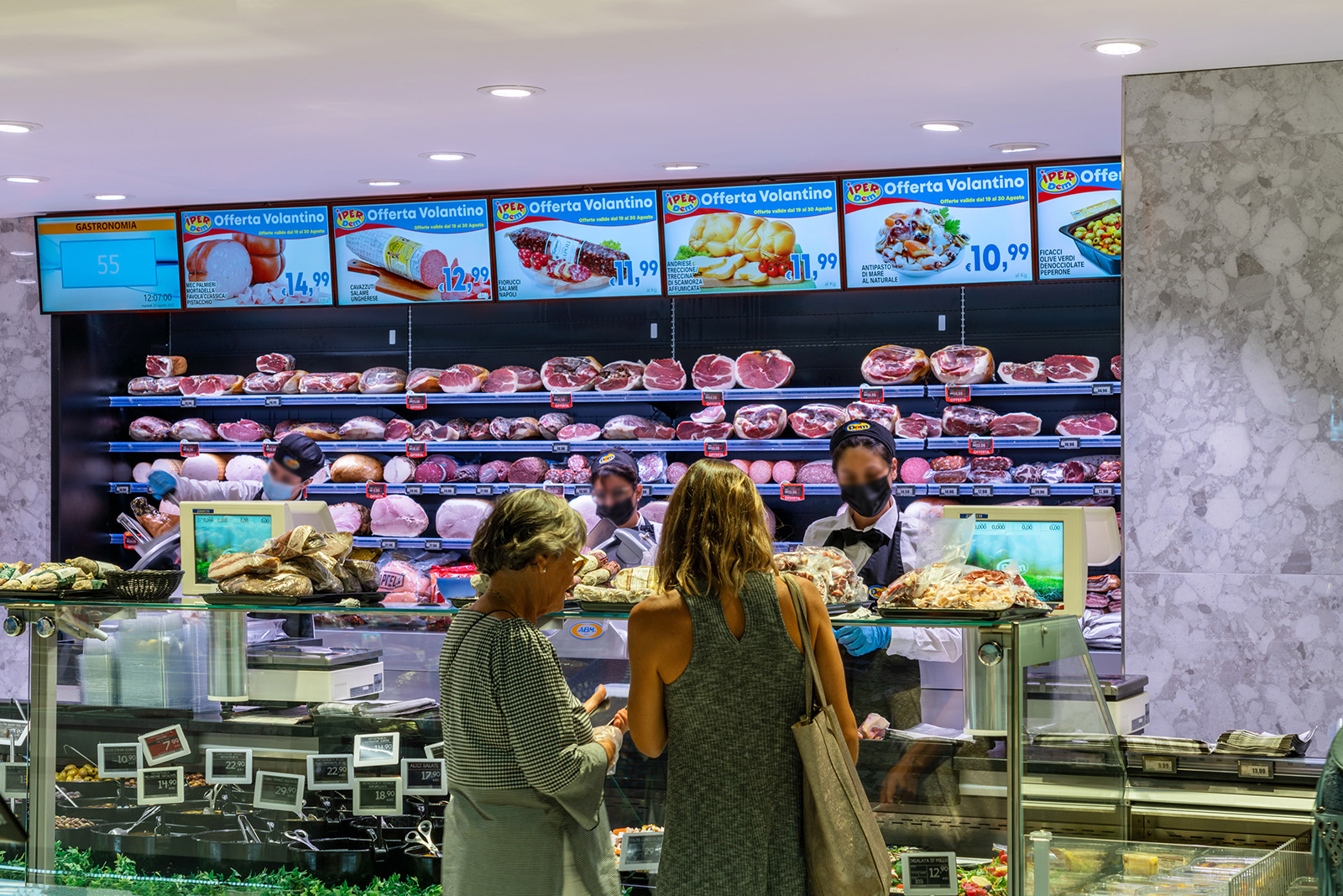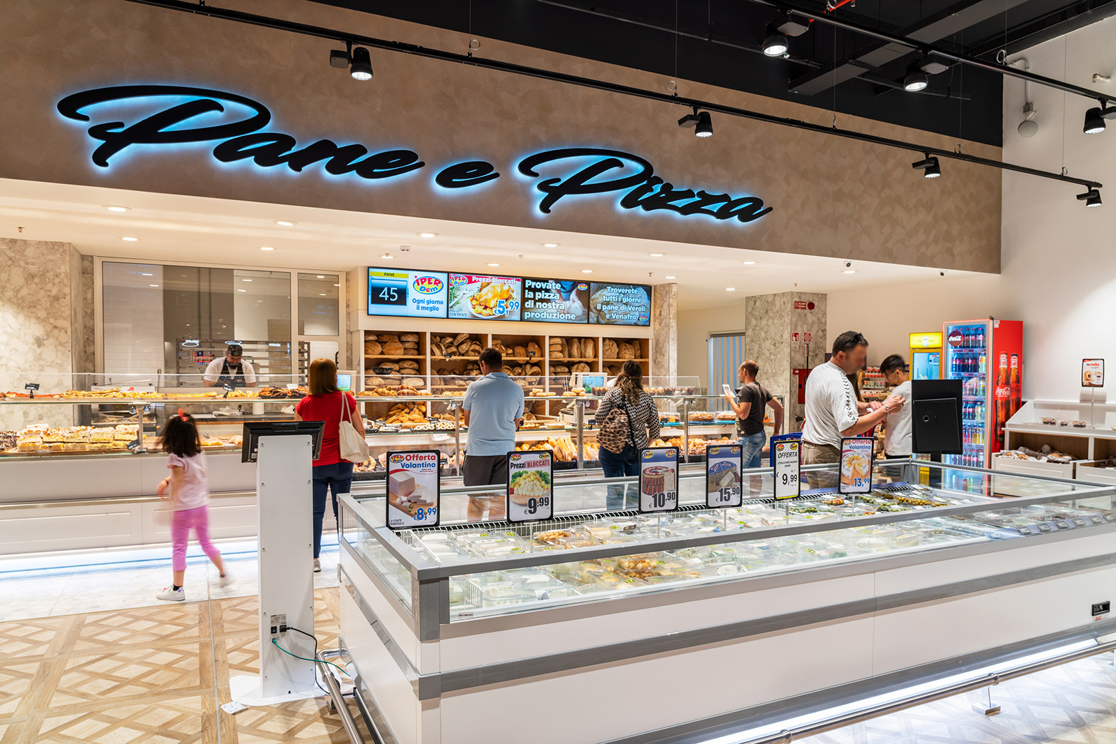 Nei reparti Pane e Pizza, Macelleria, Pescheria e Surgelati sono presenti gruppi di display da 43 pollici, utilizzati per comunicare offerte, suggerire specialità o supportare il sistema eliminacode, mantenendo alta l’attenzione dei clienti in attesa.